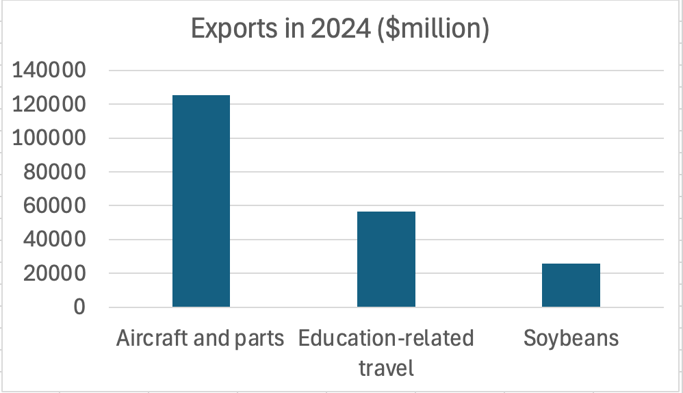美国人往往不会将教育视为美国的主要出口产品之一,但事实确实如此。国际学生通常支付全额学费,很少或根本得不到财政资助。以下是“与教育有关的旅行”,也就是以国际学生为中心的收入,与美国其他主要出口产品的对比: