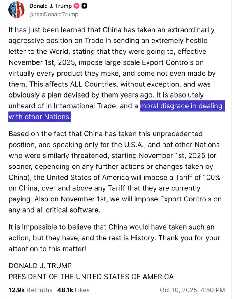 如今,特朗普正在意识到——令他本人显然震惊的是——其他国家在贸易领域也可以采取强硬的反制措施。对于中国针对数字技术关键原材料——稀土——所实施的新出口管制,他的反应如果不是因为利害关系如此重大,本来会显得滑稽可笑: