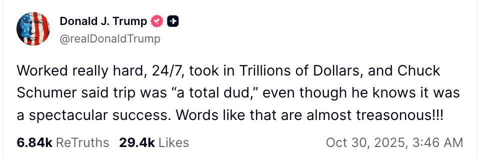 特朗普知道他已经把世界领导权拱手让给中国了吗?很可能不知道:在他最近的亚洲行程中,外国领导人对他阿谀奉承,还送了他各种私人礼物,所以他回到美国后,自尊心反而比以往更高涨。离他近的人谁也不敢告诉他:如果你看清他所同意的实质内容,就会发现这实际上是一场耻辱性的撤退。当 Chuck Schumer 指出特朗普没有做到的事情时,他的反应是歇斯底里的: