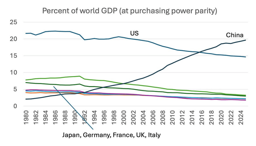 但是,中国的崛起确实制造了地缘政治问题。直到1980年代,全球最大的经济体几乎全是民主国家,与美国通过正式条约并共享政治价值观结盟。民主国家作为一个整体,在21世纪初期仍占主导地位。但如今,中国的经济——按其实际生产的商品与服务数量计——已比美国大,也远大于任何其他国家。
