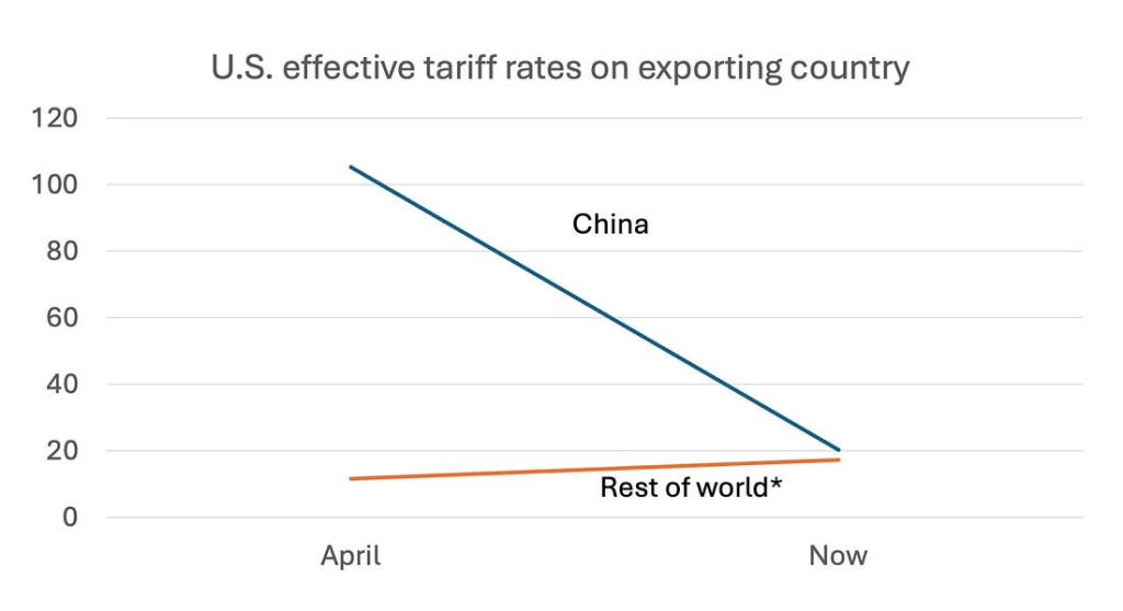 但现在特朗普已大幅削减对中国的关税。根据预算实验室的估算,中国现在面临的关税与其他国家(不含加拿大和墨西哥)所受关税差别不大。例如,中国现在面临的关税并不比我们昔日盟友——欧盟国家——所征关税高多少。